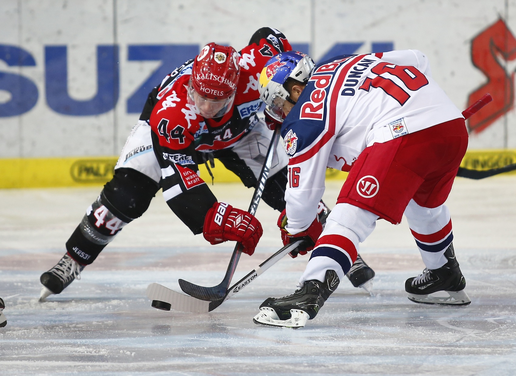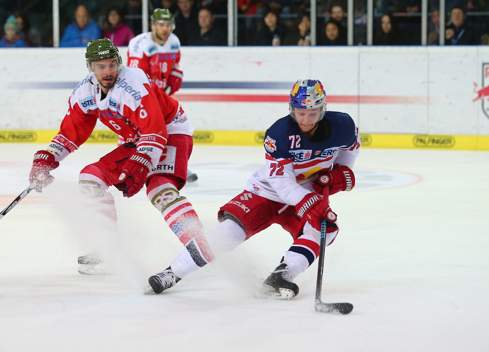Salzburgs Antwort kam aber sofort. Brett Sterling kam in der 21. Minute auf der rechten Seite an die Scheibe und schoss aus kurzer Distanz und unter Mithilfe des Znojmer Goalies zum 2:2-Ausgleich ein. Danach entbrannte ein Spiel auf Biegen und Brechen, das weniger von echten Torchancen, dafür umso mehr vom hohen Einsatz beider Teams lebte. Beide Finalisten stürmten bedingungslos nach vorn und fuhren jeden Check fertig. Brisante Situationen entstanden auf beiden Seiten dennoch im Minuten- takt. In der 27. Minute etwa schoss Znojmos Colton Yellow Horn aus kurzer Distanz zweimal nacheinander, fand aber keinen Weg an Juuso Riksman vorbei. In der 34. Mi- nute setzte Salzburgs Luciano Aquino zu einem Solo an, wurde aber noch entschei- dend gestört, kurz darauf knallte die Scheibe hinter Salzburgs Goalie an die Latte. In der 38. Minute aber fuhren die Tschechen wieder einen ihrer gefährlichen Angriffe 2 vs. 1 und Jan Lattner holte prompt die Führung zurück. Nur eine Minute später fuhr Ryan Duncan auf der anderen Seite mit der Scheibe durch den Slot, zog aus Halbdistanz ein- fach ab und traf an Freund und Feind vorbei zum neuerlichen Ausgleich. Nach einem unglaublich spannenden Drittel, das kaum jemanden auf den Sitzen hielt, stand es 3:3.